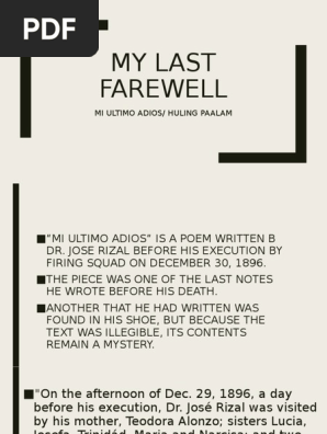 Napakaraming misteryo ng huling tulang isinulat ni Rizal kaya ang ibang mga impormasyong nahanap ay magkakasalungat pero ninais ko. He said that the land and people have suffered much. Join Facebook to connect with Huling Paalam and others you may know.