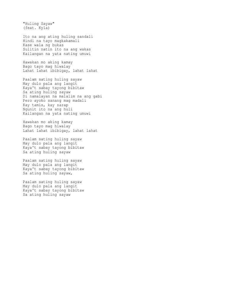 The collaboration with pop star Kyla in Huling Sayaw yields positive results mainly due to the songs savor-the-fleeting-moments scene the cinematic image of a couple bound by music and. E -- A2F -- A2 --- A2B - Cm7 -- E -- A2 ---- VERSE 1 Jay Cm7 Bsus A2 Ito na ang ating huling sandali Cm7 Bsus A2 Hindi na tayo magkakamali Cm7 Bsus Kasi wala ng bukas A2 Cm7 Sulitin natin ito na ang wakas Bsus A2 Kailangan na yata. Sa ating huling sayaw.